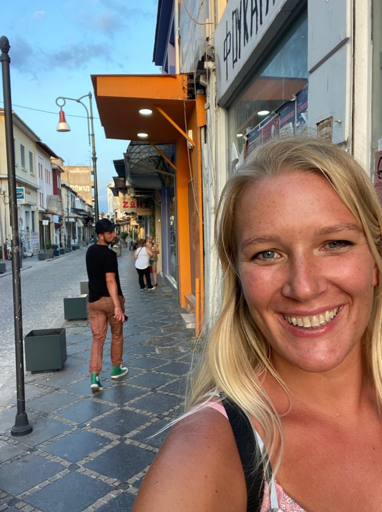After swimming in the beautiful Paralia and hiking Olympus we are headed for a small inland village named Ioannina. Oh boy was this an adventure! Our bus ride got us there a little later than we’d expected and we were famished! We stopped a local Tavera to eat Gyros and Greek salad. It was so delicious! Now we search for a place to spend the night. This ended up being a catastrophe. We were mislead and carried our luggage miles and miles down a small village road only to find all the inns were closed for the night! We searched until about 12am! Finally we gave up and slept outside!! Well I didn’t sleep at all. We laid there and let mosquitoes eat us until dawn. I took a photo of our “camping” adventure view. My headache was crushing me, my husband then found us an hotel in the morning and we got to rest. After a few hours of sleep I got up and walked about the town. I ate souvlaki and filled my water outside looking at the mountains. The quaint village is just as Greek as the seaside cities. Packed with all its European charm. Interesting fact about this city is it has lots of old mosques from when the Ottoman Empire ruled Greece. It’s not on a beach but the lakeside views are breathtaking as well. Off the the main road here you won’t see many tourists. Just Greek people living life, which they really know how to do. If I’ve learned anything in my travels to Greece is that unlike Americans Greeks really know how to live, they work hard, but they also love hard and live life every single day, and make sure that they enjoy each day of their lives. Americans could learn a thing or two from the Greeks. Every evening, the small restaurants are overflowing with locals just laughing and loving the company of their family and friends. I love it.